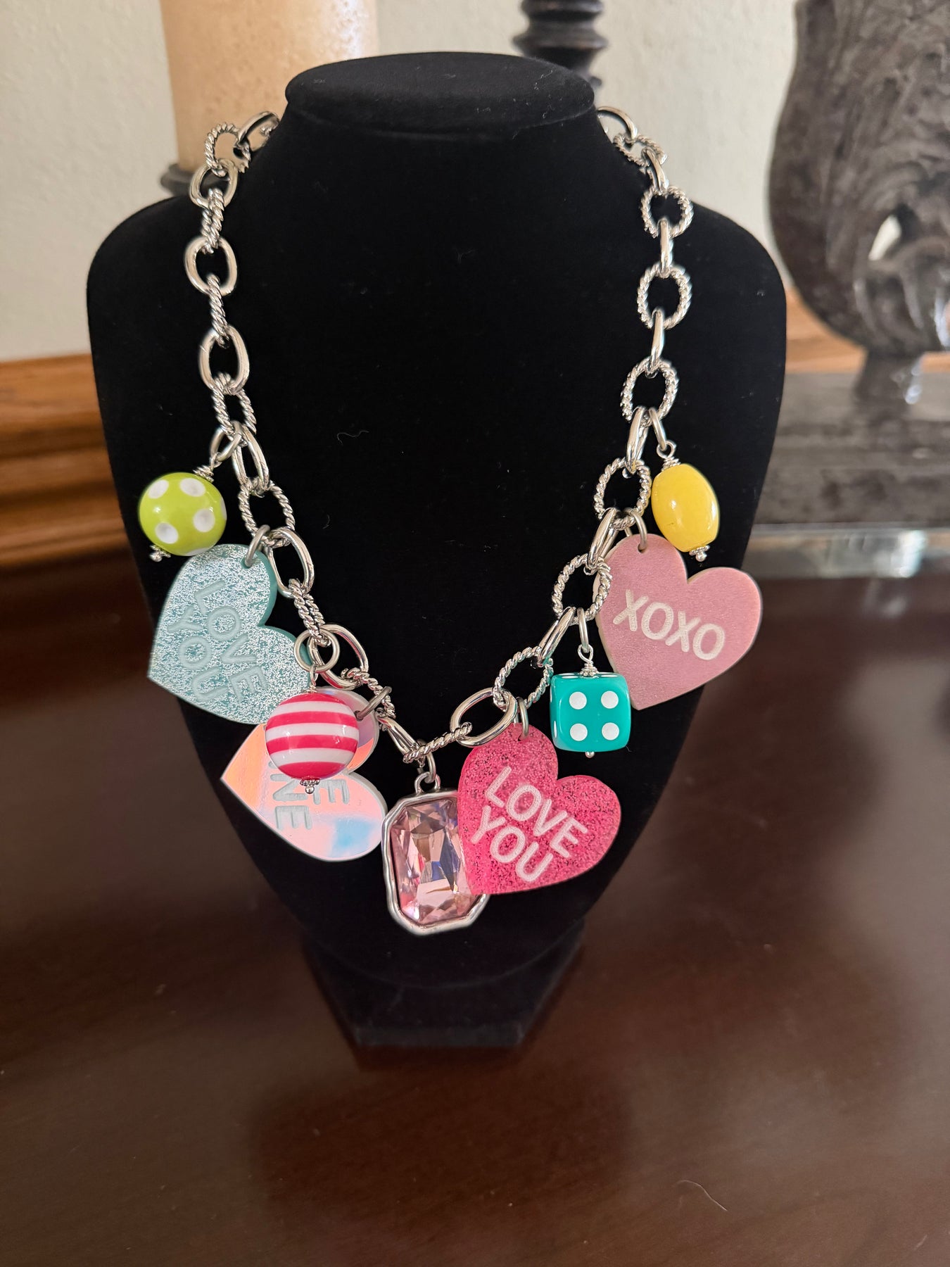 What a delightful piece! This Conversation Hearts Necklace is pure charm wrapped around your neck. Featuring vibrant acrylic conversation hearts paired with adorable beads and sparkling gems, it's a playful nod to nostalgia with a modern twist. The 18" silver link chain with toggle clasp sits perfectly at any neckline, making it easy to slip on and off. Handcrafted by a talented Kansas artist, this necklace brings personality and whimsy to any outfit—whether you're channeling retro vibes or just want to spread a little joy. Sweet, sentimental, and undeniably fun!
